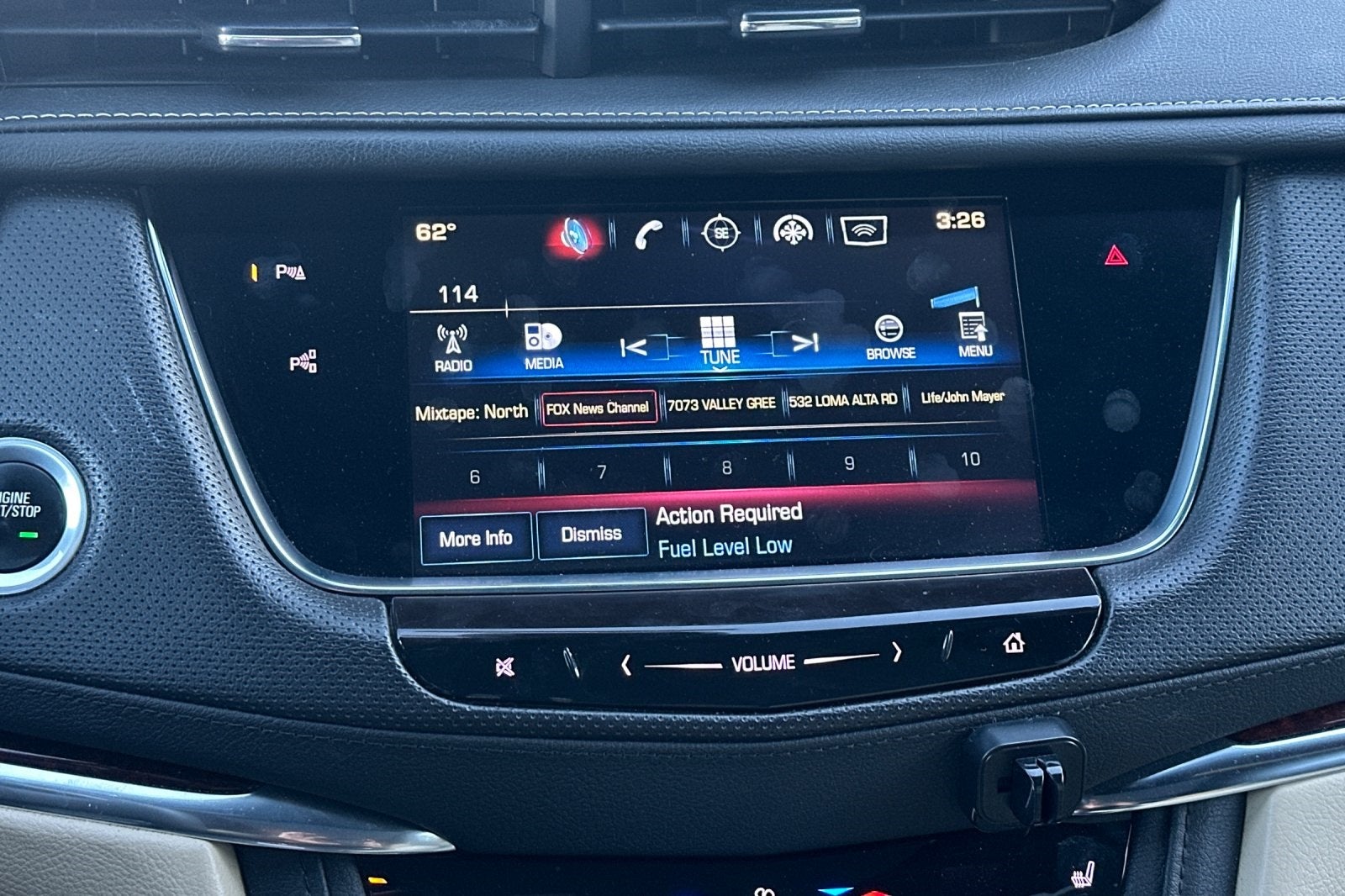 - Cadillac CUE Information and Media Control System with Embedded Navigation, AM/FM stereo with 8" diagonal color information display, four USB ports, two auxiliary power outlets, auxiliary input jack, Natural Voice Recognition and Phone Integration for Apple CarPlay and Android Auto capability for compatible phone