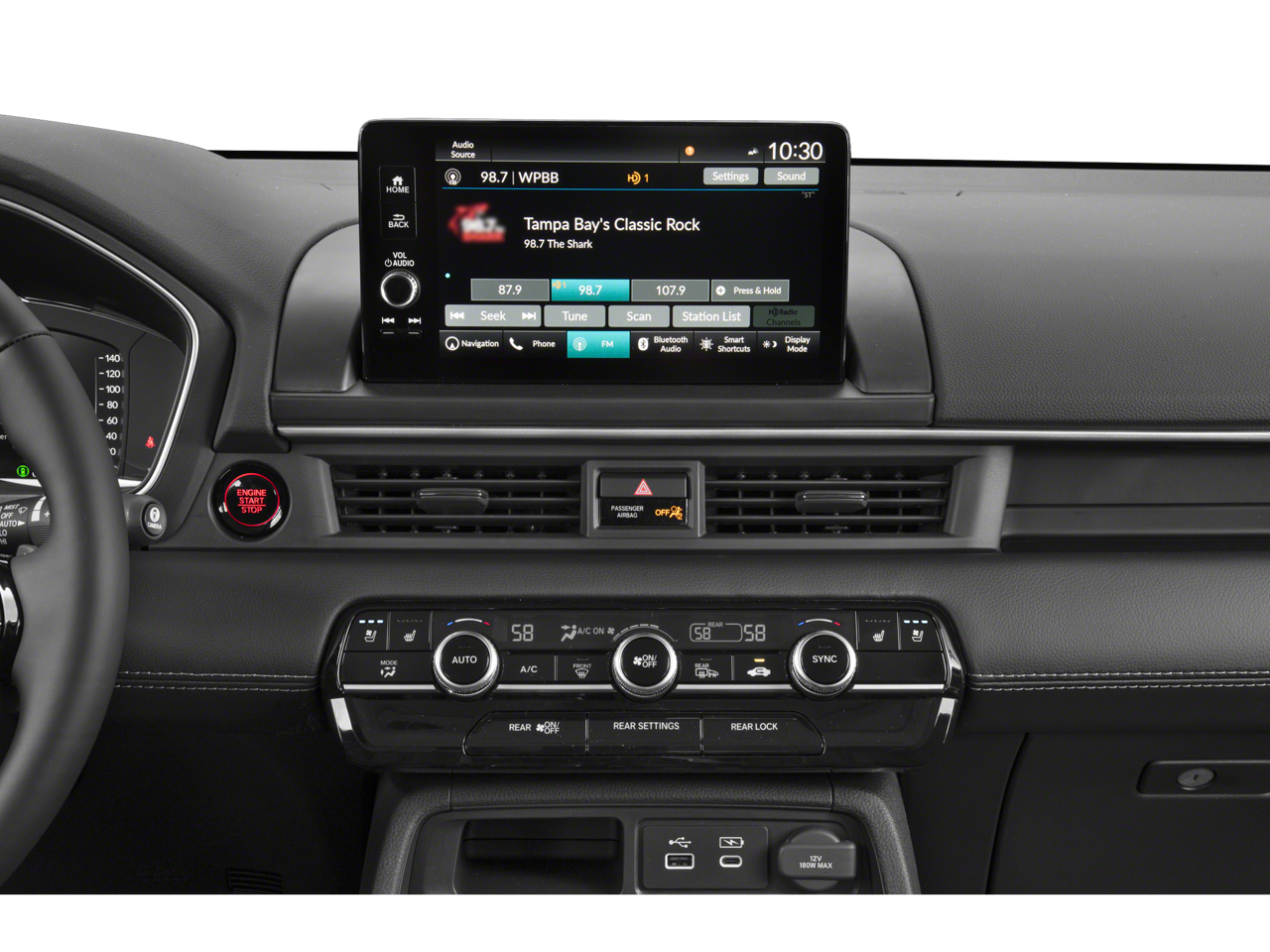 - Radio: Bose Premium Sound System -inc: 12 speakers w/subwoofer, 9" color touchscreen, Bluetooth® HandsFreeLink and streaming audio, Radio Data System (RDS), Speed-sensitive Volume Compensation (SVC), front 12-volt power outlet, wireless Apple CarPlay and Android Auto compatibility, Wi-Fi hotspot capability, Qi wireless phone charger, SMS text message function, SiriusXM (SiriusXM requires a subscription after any trial period, If you decide to continue your SiriusXM service at the end of your trial subscription, the plan you choose will automatically renew and bill at then-current rates until you call SiriusXM at 1-866-635-2349 to cancel, See our customer agreement for complete terms at www.siriusxm.com, Fees and programming subject to change, Available in the 48 contiguous United States and D.C, SiriusXM and all related marks and logos are trademarks of SiriusXM Radio Inc.), HD Radio, 2.5-amp USB type-A smartphone/audio interface port in front console, 3.0-amp USB type-C charging port in front console, Honda Satellite-Linked Navigation System w/voice recognition and Honda Real-Time Traffic (The Honda Satellite-Linked Navigation System functions in the United States (not including territories, except Puerto Rico) and Canada, Honda HD Digital Traffic service is only available in the United States, except Alaska, Please see your Honda dealer for details.), HondaLink subscription services ( complimentary trials of security for 1 year and a remote/concierge trial for 3 months, Enrollment is required to access the remote/concierge trial and to access certain features of security, At the end of each trial period, purchase of a subscription is required to continue the respective services.), multi-zone audio and CabinTalk in-car PA system
